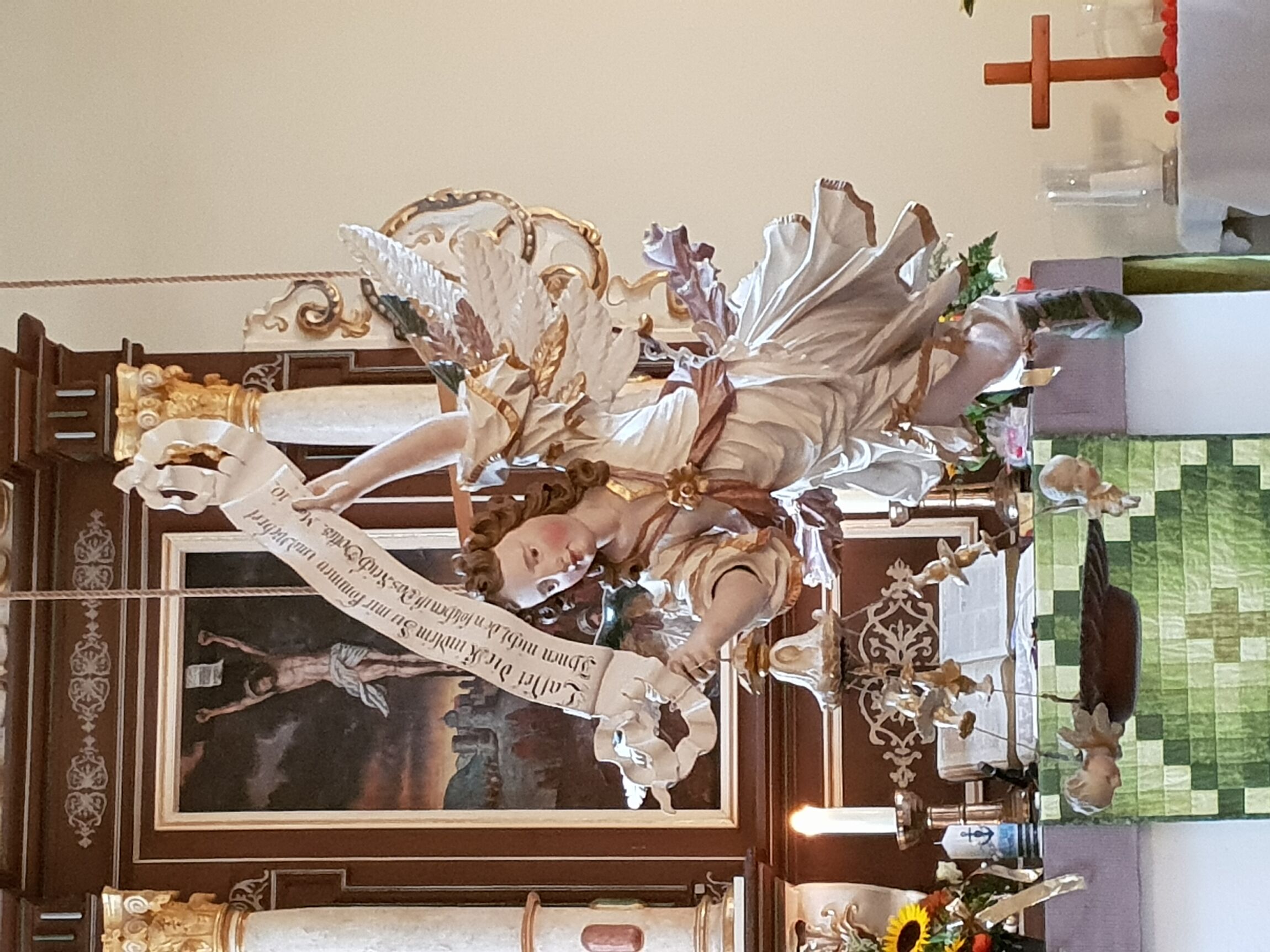 Der Altar zeigt in der Mitte die Kreuzigungsszene. Maria, die Mutter Jesu, liegt in den Armen der Jüngerinnen. In der Erzählung hatten sich die Jünger auf und davon gemacht, nur die Frauen blieben zurück.
