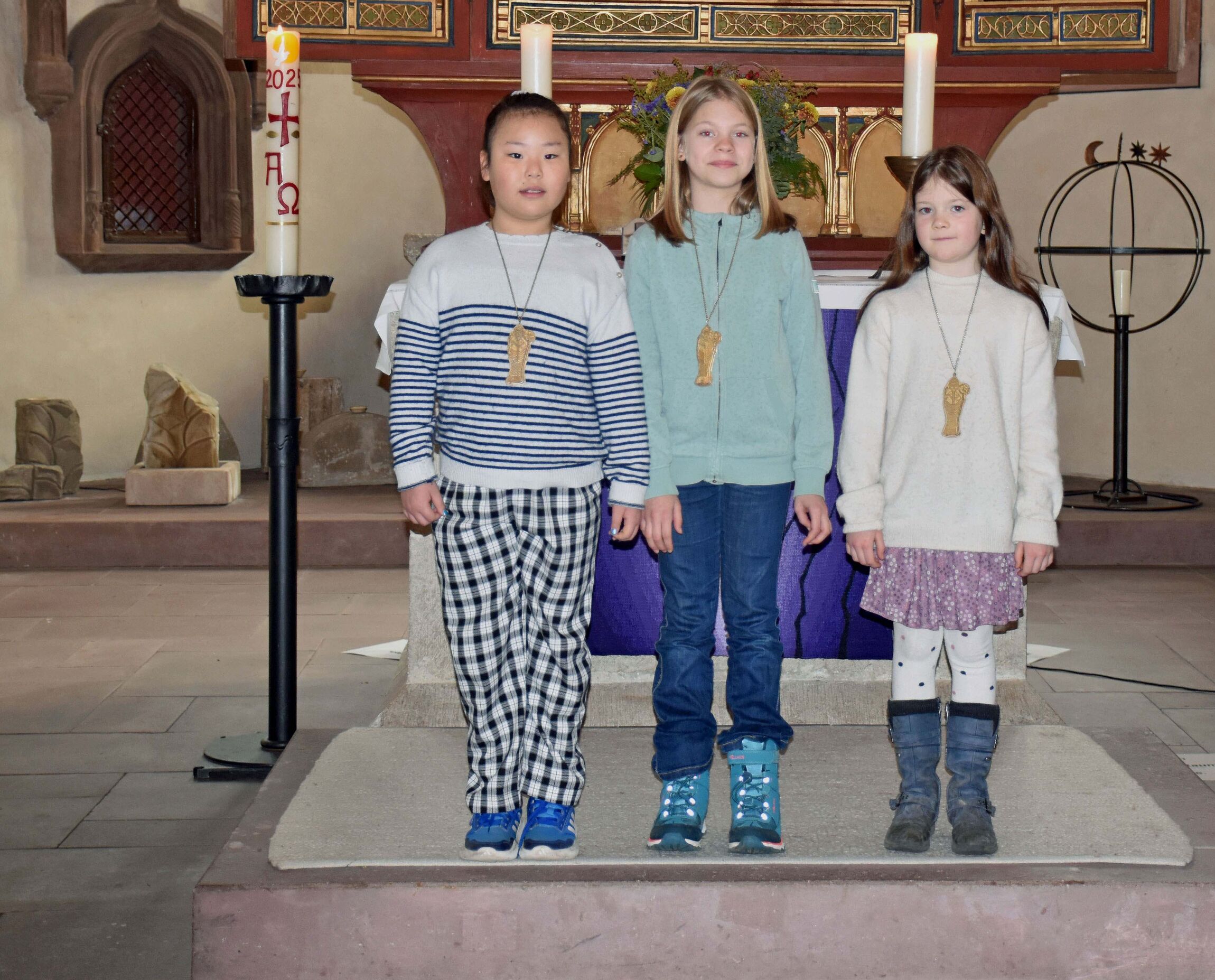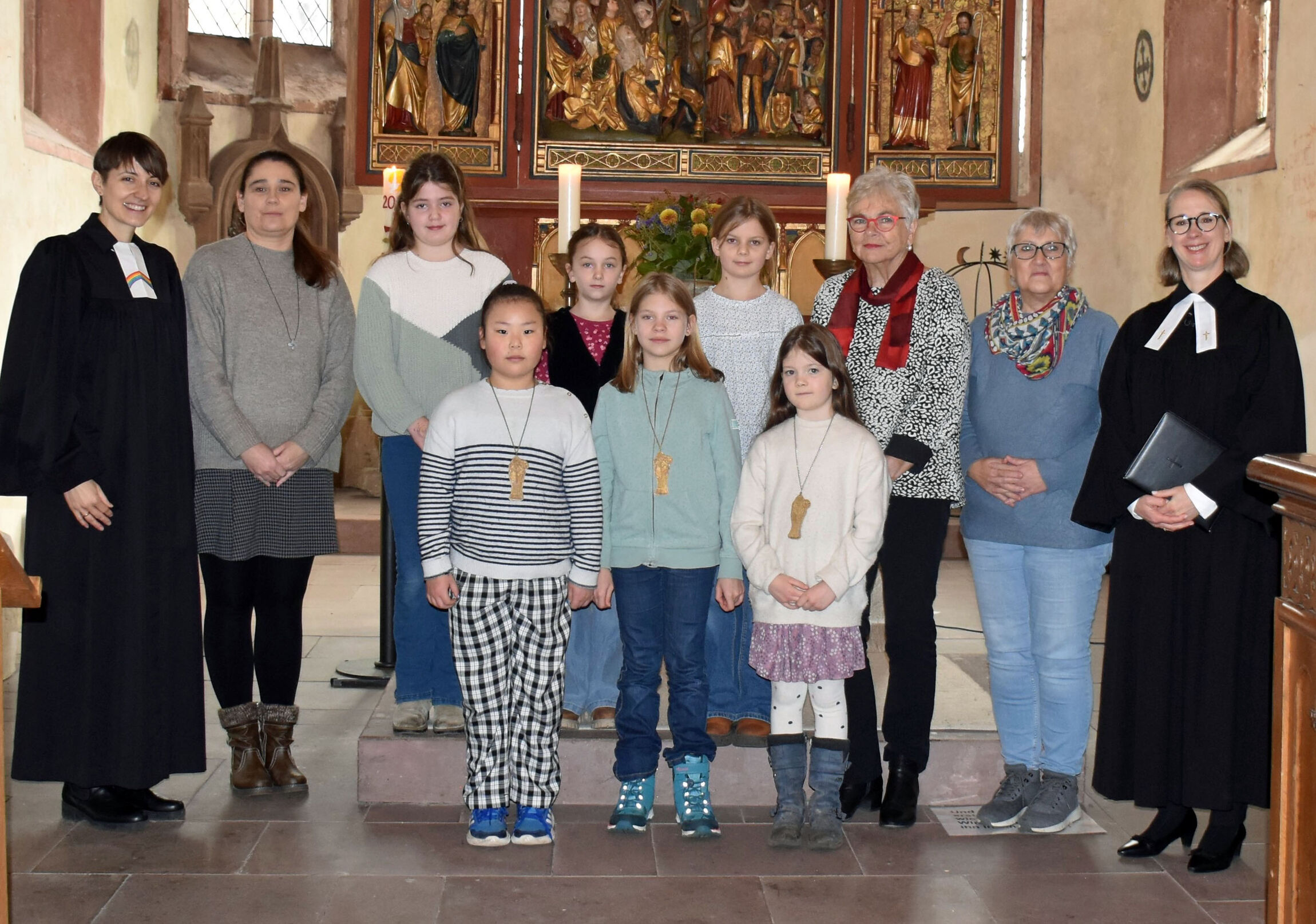 Im Gottesdienst am 8. Dezember 2024 wurden die drei neuen Kinderbischöfinnen von Superintendentin Marit Günther-Menzel und Pn. Anna Kiefner in ihr Amt eingeführt, begleitet von ihren Patinnen.