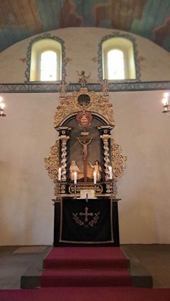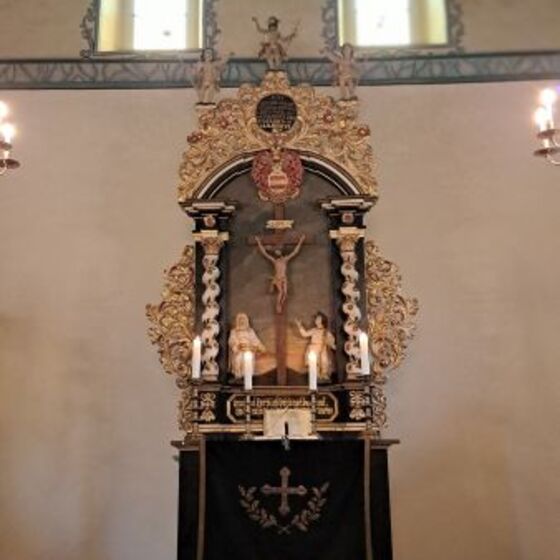 Der Altar zeigt in der Mitte die Kreuzigungsszene. Man sieht in der Mitte den gekreuzigten Jesus, daneben Maria, seine Mutter und seinen Lieblingsjünger Johannes, so bezeichnet ihn zumindest das eventuell nicht ganz unparteiische Johannesevangelium. Die Szene zeigt einen Teil der Kreuzigungsgeschichte, wie sie auch nur der Evangelist Johannes erzählt: Der Gekreuzigte verbindet Maria und Johannes und bittet sie darum, füreinander als Mutter und Sohn zu sorgen. Darüber ist das Wappen der Wangenheims zu sehen. Noch eine Etage höher sieht man, umstellt von Engeln, den Auferstandenen. Der Altar will also sozusagen von unten nach oben gelesen werden, von der gebeugten in die aufgerichtete Haltung. Und wenn Sie schon mal da sind: Schleichen Sie doch mal hinter den Altar. Dort haben sich die Handwerker der letzten Renovierung verewigt.