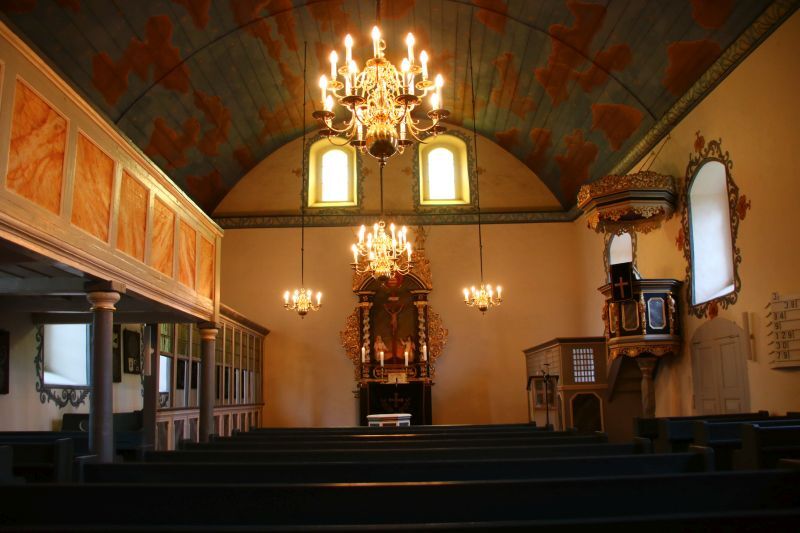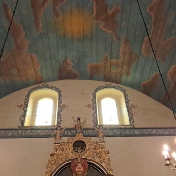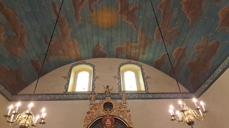 Betreten wir die Kirche. Man geht auf der Südseite hinein und steht zunächst unter der doppelgeschossigen Empore. Ein paar Schritt richtig Altar und ein weiter, sternenbedeckter Himmel breitet sich aus. Ein hellblauer Himmel, rosane Wolken (wenn das Licht in der Kirche richtig fällt) und viele kleine und große Sterne. Über dem Altar eine Sonne, in der der Gottesname in hebräischen Buchstaben steht. Dass die Waaker Kirche so einen schönen Himmel hat, war viele Jahrzehnte nicht bekannt. Bei Restaurierungsarbeiten 2004 erschien plötzlich ein kleiner Stern und dank vieler Spenden konnte der Himmel wieder gänzlich freigelegt werden. Es ist die ursprüngliche Bemalung der von der Familie Wangenheim in Auftrag gegebenen Innenausstattung.