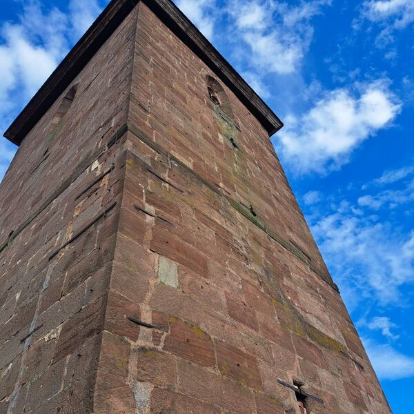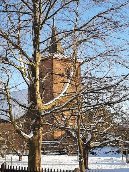 Steht man vor der Kirche, fällt zunächst der mächtige Turm ins Auge. Dieser gehört zum ältesten Teil der Kirche und stammt noch aus dem 14. Jahrhundert. So manches Mal wird er auch bei Angriffen Schutz geboten haben. Die kleinen Löcher in den Steinen sind allerdings keine Einschusslöcher – sie dienten beim Bau der Kirche als Halterung. Der Turm ist mit einem spitzen Helm bedeckt. Und mit ein bisschen Fantasie sieht er aus wie ein Hexenhut. In der Kugel an der Turmspitze wurden bei der letzten Öffnung Unterlagen gefunden, die als eine Art Zeitkapsel dort hinterlegt wurden. Zu sehen sind diese im Museum auf dem Gutshof.